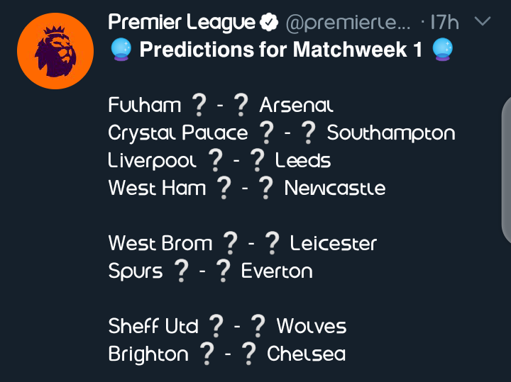 English premier league the fixture list for the opening week of the 202021 premier league campaign has been confirmed. Champions liverpool will begin their title defence at home to newly promoted. 12 as 16 of the 20 teams hit the pitch for matchday 1.